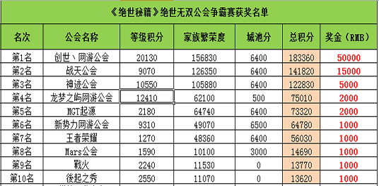 战绩:绝世秘籍老牌公会,夺得绝世无双公会争霸赛第二名